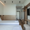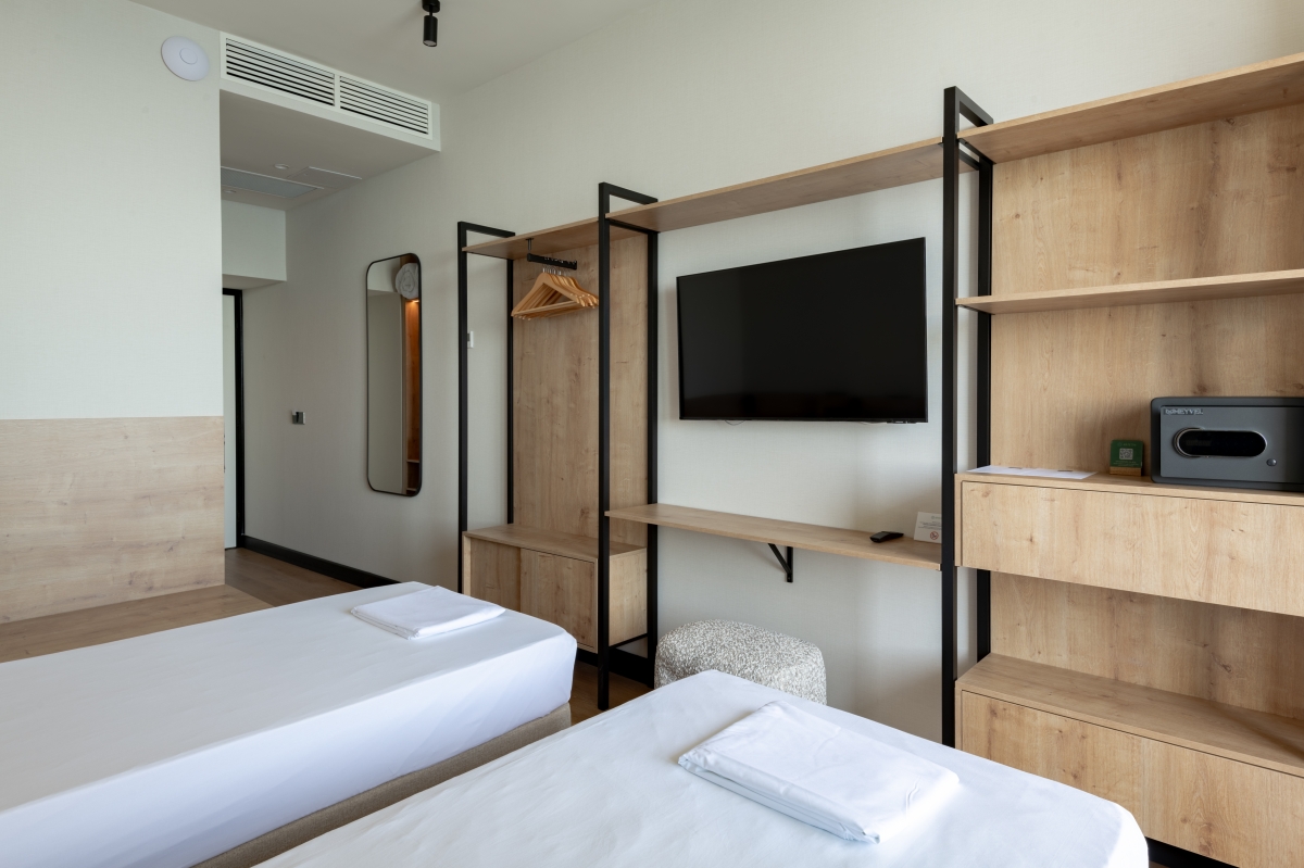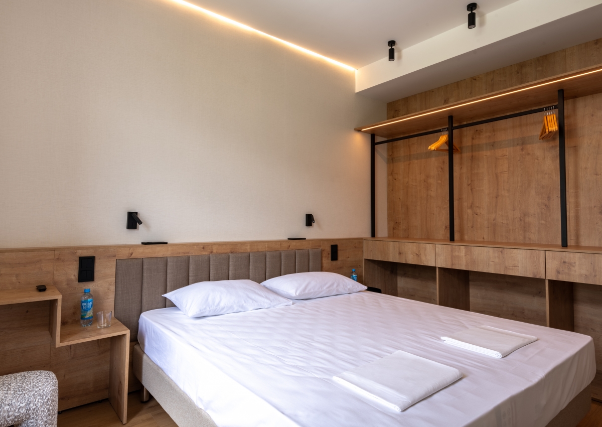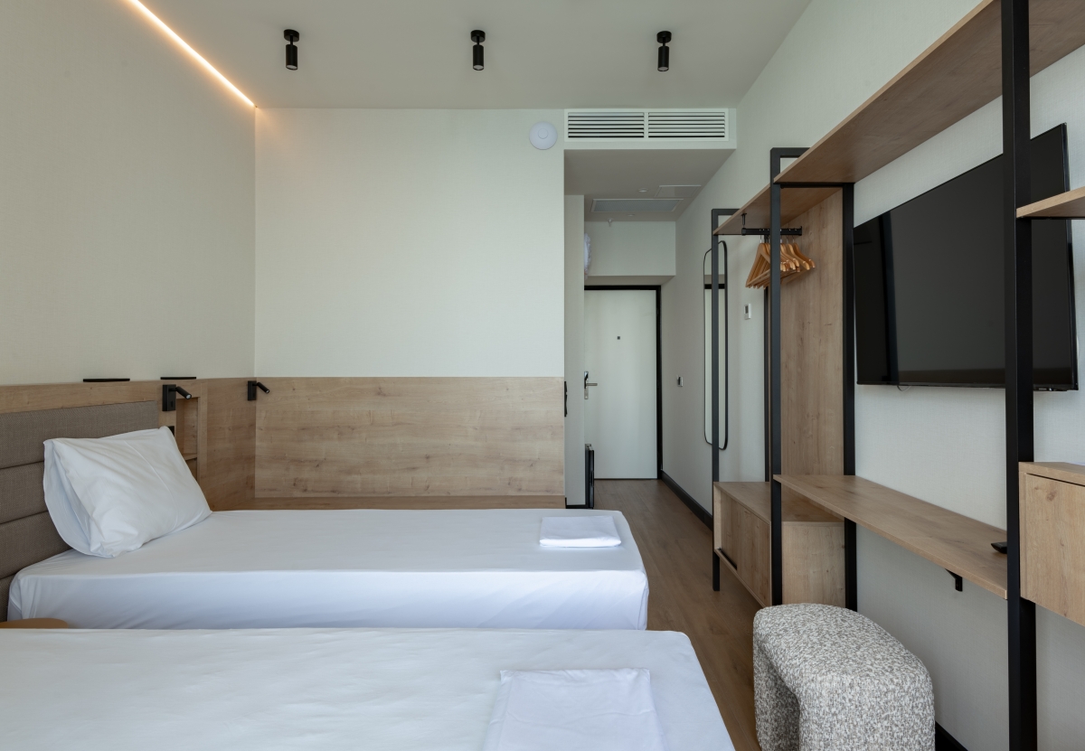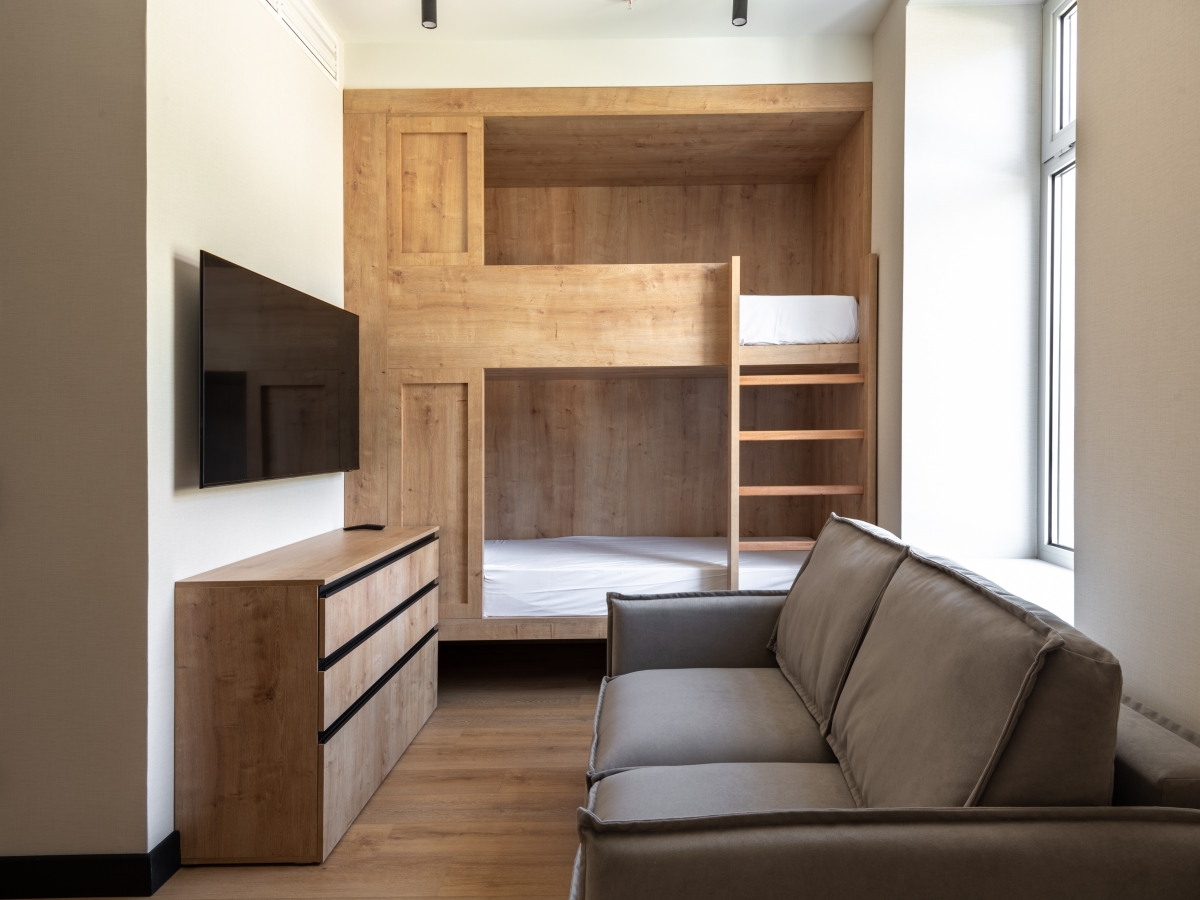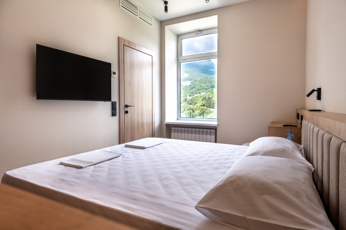 В номере двуспальная кровать, двухъярусная кровать, прикроватные тумбочки, светильники, вешалка, зеркало, столик туалетный, стулья, шкаф, электрочайник, кондиционер, телевизор, холодильник, санузел (душ, туалет, умывальник, фен, халаты, тапочки, набор полотенец). Номер без балкона. Дополнительное место – двухъярусная кровать. Максимальное размещение – 4 человека.