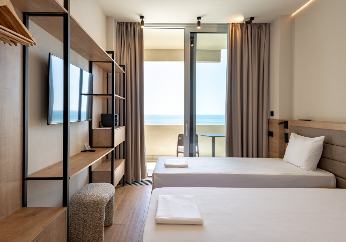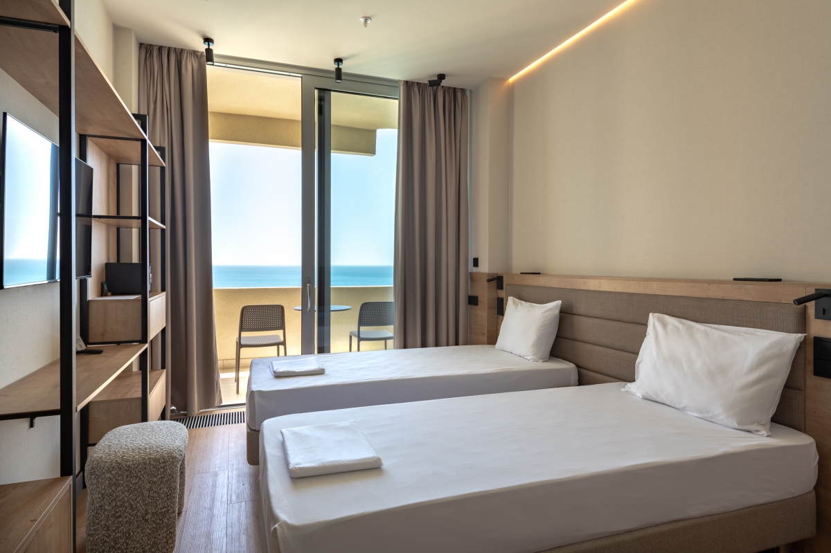 В номере две раздельные или одна двуспальная кровать, прикроватные тумбочки, два светильника, шкаф для одежды, телевизор, холодильник, кондиционер, электрочайник, санузел (душ, умывальник, туалет, фен, набор полотенец, тапочки, косметические средства). Номер с балконом с прямым или боковым видом на море. Дополнительное место – раскладное кресло или ламелевая раскладушка.